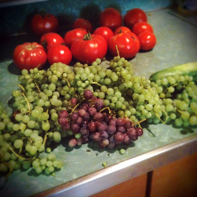 I can't keep up!!! We have red tomatoes hanging on the vine and sitting in the kitchen. Zucchini growing to the size of infants, cukes coming out our ears, peppers to boot, raspberries too many to count, and now the seedless grapes are here! YUM! I'm so excited and a little overwhelmed!